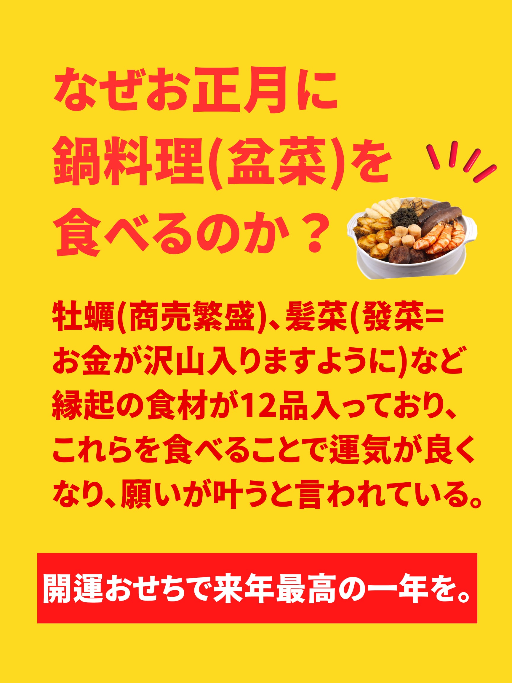 -     【12月31日店頭受取】今だけ特別価格!大海老→伊勢海老変更!南粤おせち 新年盆菜 スープ大根増量 ご注文は2人前から 1人前からの選択不可 スープや大根の増量 ¥15,800 南粤おせち(新年盆菜)ご予約案内 ※写真はイメージ(6人前)です。 ■広東流で新年をお祝いしませんか? 厳選した高級中華食材を贅沢に詰め込んだ「盆菜(プンチョイ)」は、 客家料理を起源とする伝統的なお祝い料理です。 香港や中国・広東省では、家族や仲間が集まるお正月の定番料理として親しまれています。 縁起の良い食材を熱々の土鍋で味わう「南粤おせち」で、 新しい一年の幸運を願い、華やかなお正月をお迎えください。 ■ご予約受付期間 受付期間:2025年10月28日(火)〜12月6日(土) ※数量限定のため、予定数に達し次第終了いたします。 ■ご予約特典 手作り小籠包プレゼント! 今回、2人前をご注文いただいたお客様に「手作り小籠包」をプレゼントいたします。 ※数量限定。なくなり次第終了となります。 ■価格について 1人前:16,800円(税込) ※ご注文は 2人前から承ります。 ※1人前でのご注文はできません。 土鍋再利用キャンペーン 以前、当店で「南粤おせち」をご購入いただいたお客様が、 使用済みの土鍋をご返却いただいた場合、 お礼として 2,000円(税込)の電子商品券をプレゼントいたします。 返却受付期間:2025年11月22日(土)〜12月6日(土)21:00まで 対象者:過去に「南粤おせち」をご購入いただいたお客様 商品券有効期限:2025年12月31日(水)〜2026年1月31日(土) ご利用方法: ・店内でのお食事 ・テイクアウト ・土鍋返却(着払い) にご利用いただけます。 差額分は通販サイトまたは店頭でのお買い物にもお使いいただけます。 ※ご希望の方は購入ページの「備考欄」にお申し付けください。 後日、詳細をメールにてご案内いたします。 ■お届け・受け取りについて 発送日:2025年12月29日(月)予定 ※ヤマト運輸〈冷凍便〉で発送いたします。 ※お届け日のご希望がある場合は、備考欄にご記入ください。 ※時間指定も可能です。 店頭受け取り:2025年12月31日(水) ※お受け取り開始時刻は後日お知らせいたします。 ■商品内容 【土鍋付き】南粤おせち(新年盆菜) ※2人前からご注文可能(最大8人前まで) ※6人前以上のご注文で送料無料(該当者へはメールでご連絡いたします) 土鍋サイズ(料理を含む):約10kg(6人前の場合) 横20cm × 幅20cm × 高さ10cm 焦げ防止用の鍋底シート付き ■主な食材(全12種類+特製スープ) 髪菜(藻の一種) 鮑(アワビ) 魚肚(魚の浮き袋) 大海老 椎茸(冬菇) 大根 豚足 干し牡蠣(蠔豉) 湯葉(腐竹) 阿波尾鶏の醤油煮込み 貝柱 肉団子 特製スープ(別添のタレ瓶入り) ※食材の色合いや盛り付けは写真と多少異なる場合があります。 ※アレルギー対応はいたしかねます。ご了承ください。 ※掲載写真はイメージです。 ■賞味期限 冷凍保存:商品到着後7日以内を目安にお召し上がりください。 常温保存:商品受け取り後3日以内の消費をおすすめいたします。 ■キャンセル・変更について ご注文確定後のキャンセルや内容変更は、 2025年12月6日(土)までにご連絡ください。 期日以降のキャンセル・変更はお受けできませんので、あらかじめご了承ください。